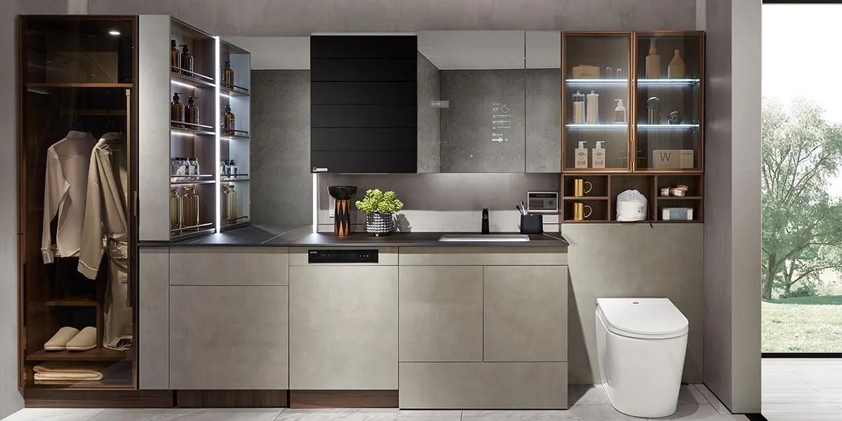 A high gloss UV finish is excellent for wet spaces like a bathroom, as it has strong characteristics of waterproof and moistureproof. At the same time, high gloss finish doors have excellent high glossiness and brightness as a mirror, which can make the bathroom brighter. The gold aluminum glass door and small wardrobe make your bathroom more luxurious.