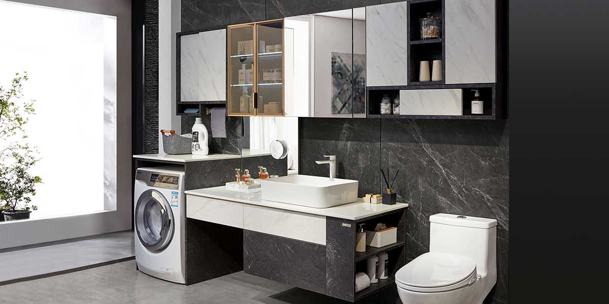 This bathroom cabinet features a white and gray laminate finish with distinctive lines. The design incorporates open cabinets and brown glass doors, giving the vanity a high-end and elegant appearance. It includes a durable integrated ceramic sink that pairs well with the smooth surface, ensuring lasting elegance. The design also features a laundry cabinet in the same space, allowing for a washing machine to be placed under the countertop, with detergent and laundry baskets neatly stored on the countertop.