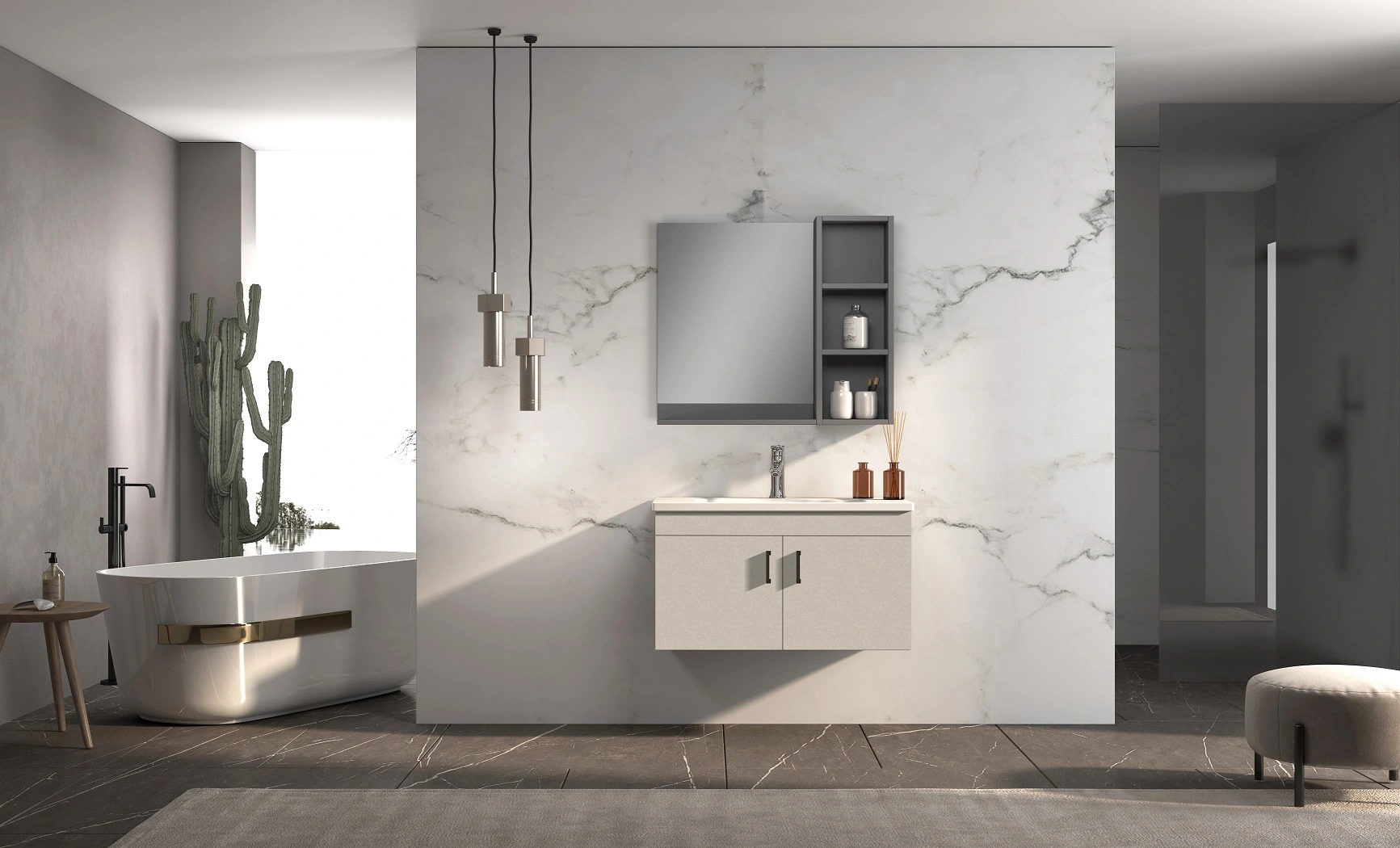 Introducing the perfect addition to your modern style bathroom decor, the beige bathroom vanity. This single wall-mounted vanity has standard widths of 700mm, 800mm, and 900mm, making it the ideal fit for any bathroom size. The vanity features a beautiful combination of finishes. The mirror cabinet and open cabinets have a sleek dark grey finish, while the basin cabinets boast a matte beige melamine finish.
