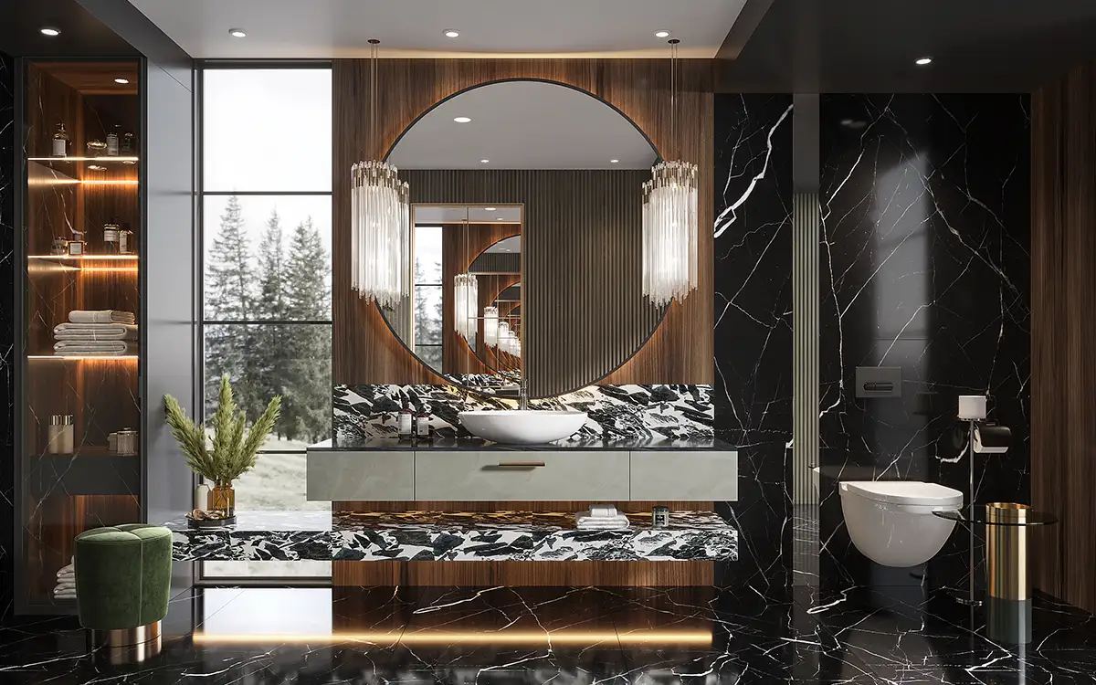 Paired with a large, wall-mounted mirror, this vanity set enhances the perception of space, reflecting light beautifully throughout the room. The modern faucet fixtures complete the look, merging functionality with high-end design.