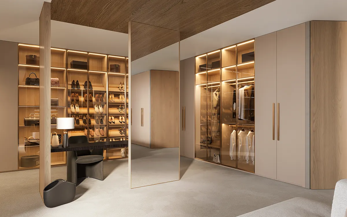 Not to be overlooked, the glass door wardrobes and open closet cabinets elevate the room’s charm, each equipped with integrated lighting. This feature not only illuminates the stored items for easy accessibility but also adds a dramatic radiance to the room, creating a captivating ambiance.