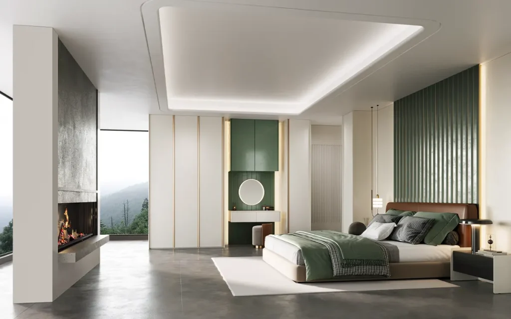 The integrated design of the wall cabinet, the exquisite metal handles, and the combination of light and luxurious metal furniture create a stylish and unique bedroom space. Glass partitions make the space feel more spacious and stylish.