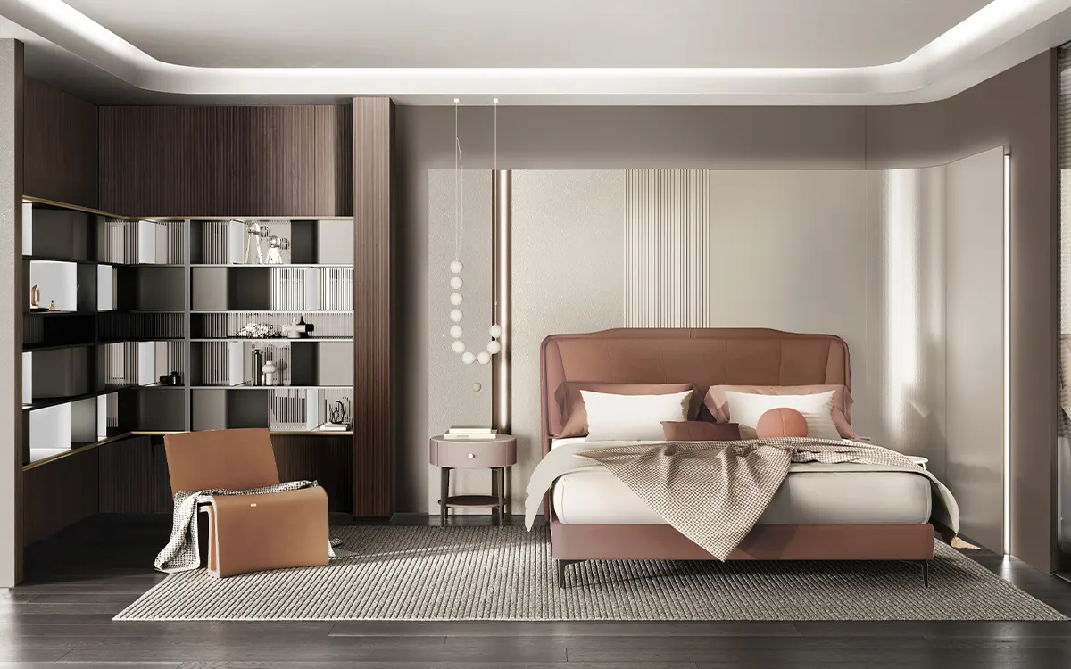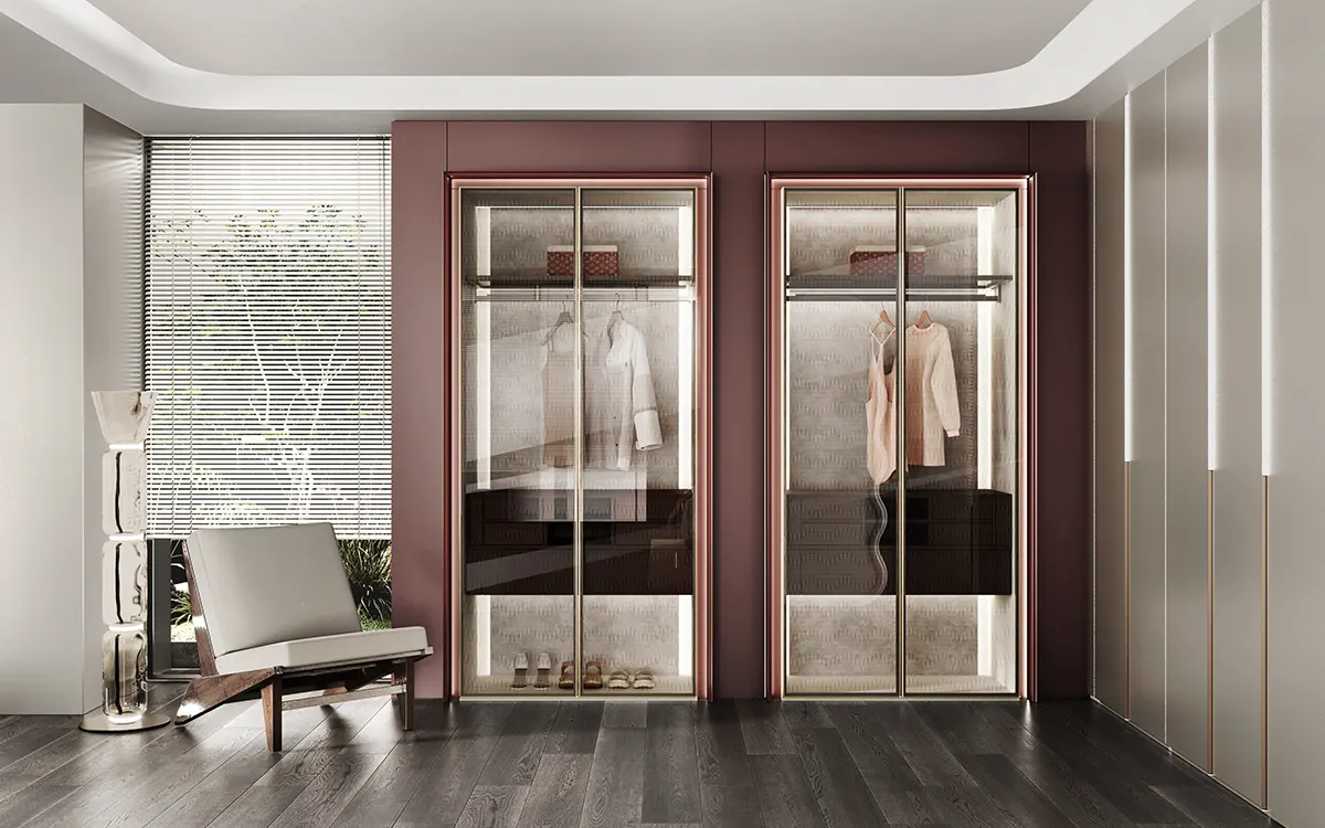 The room uses a warm, neutral color scheme with shades of brown, beige, and taupe, creating a cozy and inviting atmosphere. The walk-in closet features a sleek, modern design with a focus on clean lines and functionality. The rich burgundy wall panels provide a sophisticated backdrop, contrasting beautifully with the dark wood flooring.