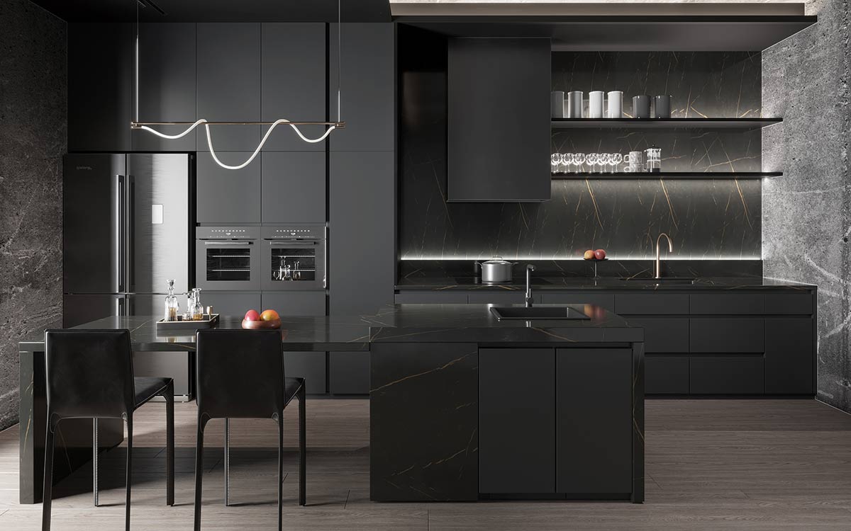 Grey is a popular colour for kitchen decor. It is versatile neutral and can match with any other colour easily. The modern fitted kitchen cabinet doors are a dark grey lacquer finish, paired with black hardware and black countertops. The black countertops and backsplash are golden-veined, dramatic and luxurious.