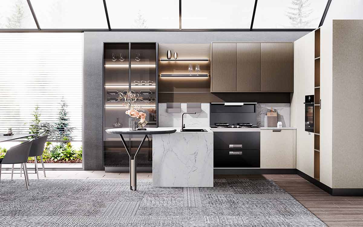 Our beige kitchen is perfect for anyone who wants to combine functionality with style. The L-shaped layout, white quartz countertop, beige melamine finish, and walnut finish on the wall cabinets and open shelves make this kitchen a standout feature in any home. The inserted lighting system adds warmth and ambiance, making this kitchen the perfect place to gather with friends and family.
