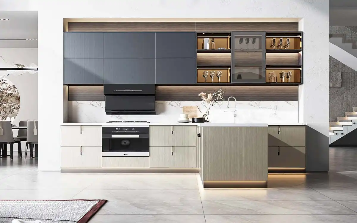We’ve chosen a stunning white quartz countertop with light grey veins to complete this elegant kitchen set. This countertop adds a classic and elegant touch to your kitchen and is highly durable and practical, making it the perfect choice for culinary needs.